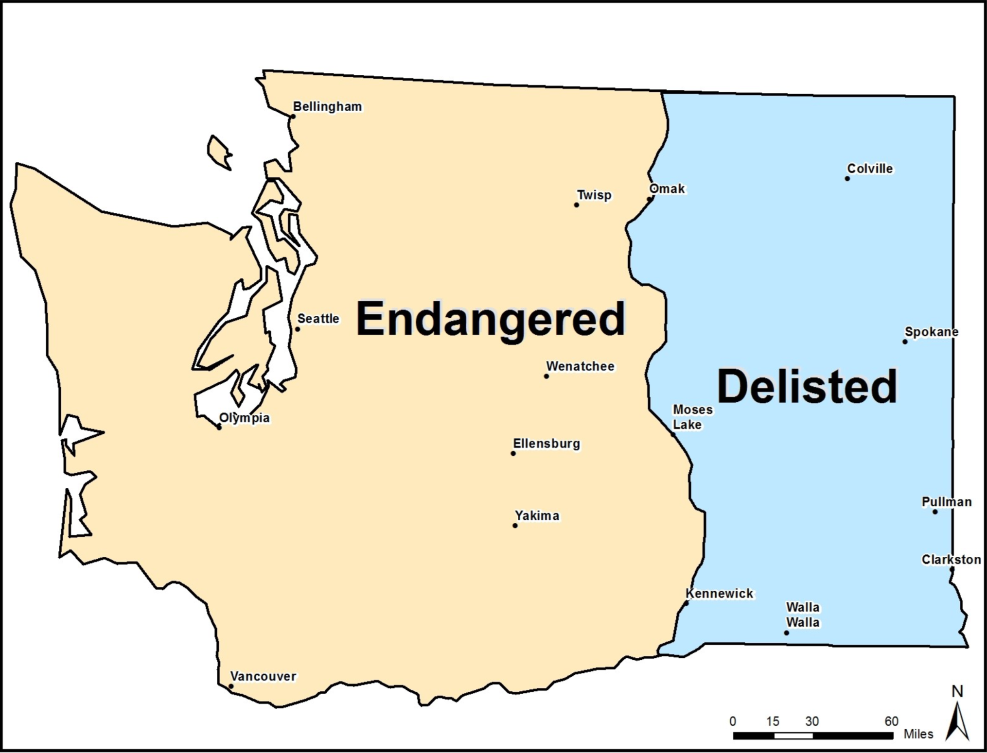 Wolves in Eastern Washington are considered part of this population segment and are therefore not federally protected. Luckily, they remain protected and managed by the Washington Endangered Species Act.