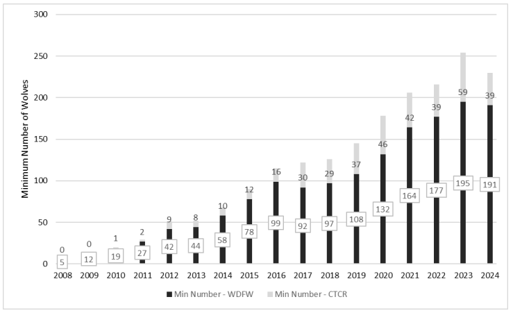 Washington’s wolf recovery is a result of natural recolonization. Gray wolves were not released into the state by biologists, but arrived here by natural migration from Idaho and British Columbia, Canada. 2024’s year-end minimum wolf count showed a population decrease for the first time in 16 years, with a 9% population decrease and a 25% plummet in breeding pairs.